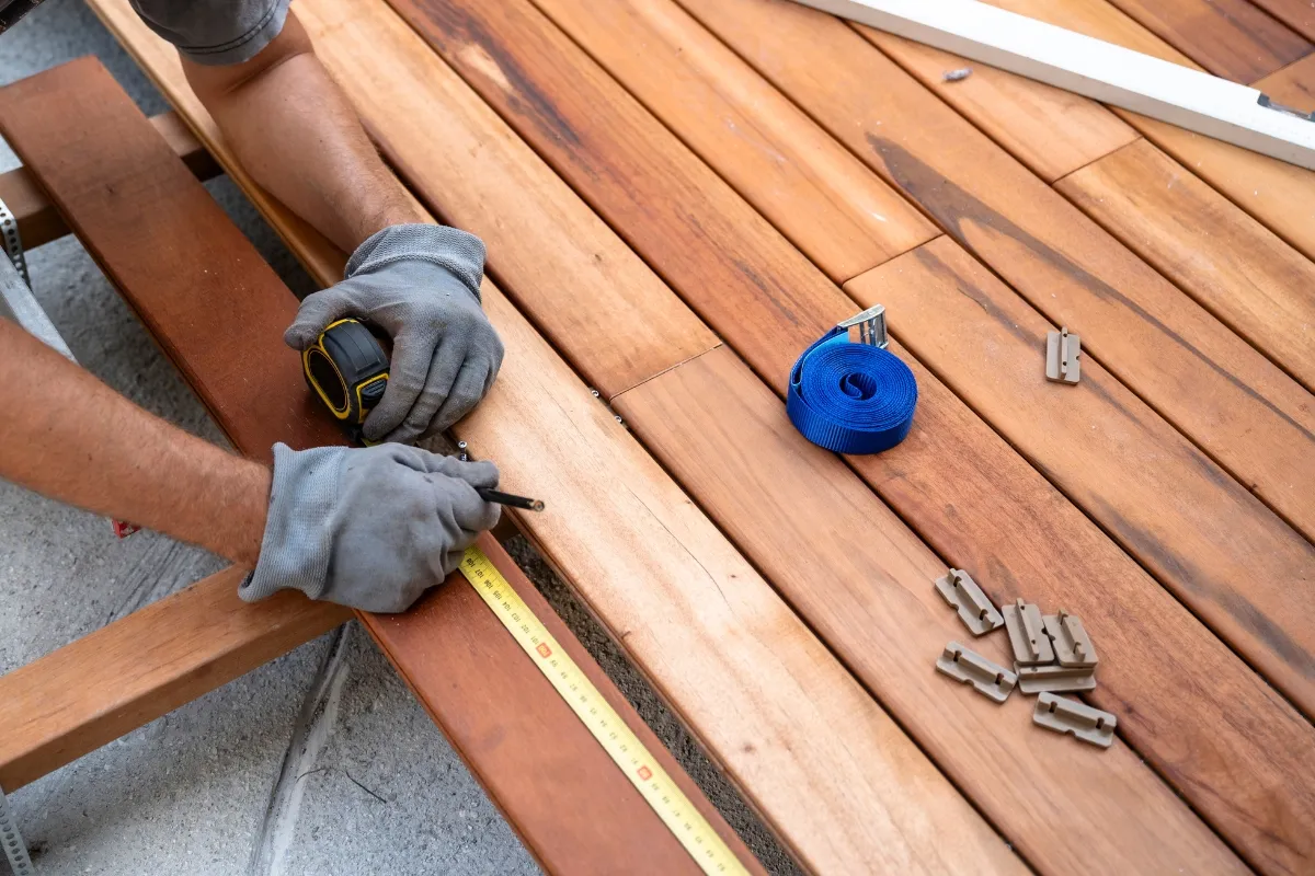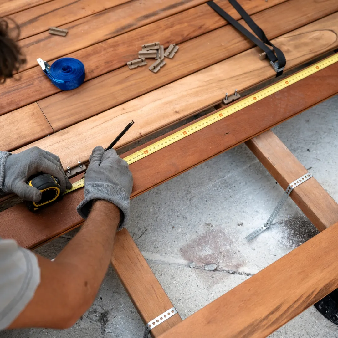 Instalação de decks em áreas externas, trazendo sofisticação e conforto com madeira tratada e resistente às intempéries.